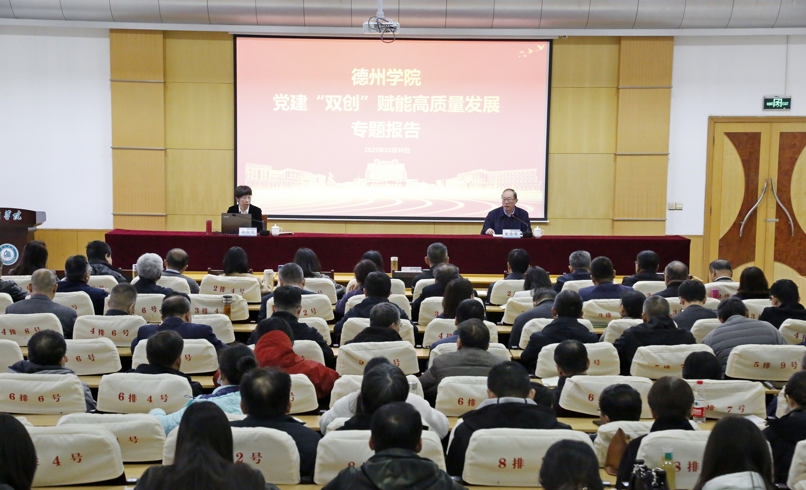 徐淑凤教授在四楼报告厅作了题为《以新时代高校党建“双创”赋能高校高质量发展》的专题报告。报告会由党委副书记张存峰主持。报告中,徐淑凤教授紧扣中央关于新时代党的建设总要求,系统梳理了教育部关于高校党建工作的系列重要部署,深入解读了新时代高校党建“双创”项目申报的核心要义和关键环节,深刻阐述了高质量党建引领保障高校高质量发展的内在逻辑与实践路径。结合齐鲁理工学院及个人丰富的实践经验,徐淑凤教授还分享了推动党建工作与学校中心工作深度融合、同频共振的宝贵经验。