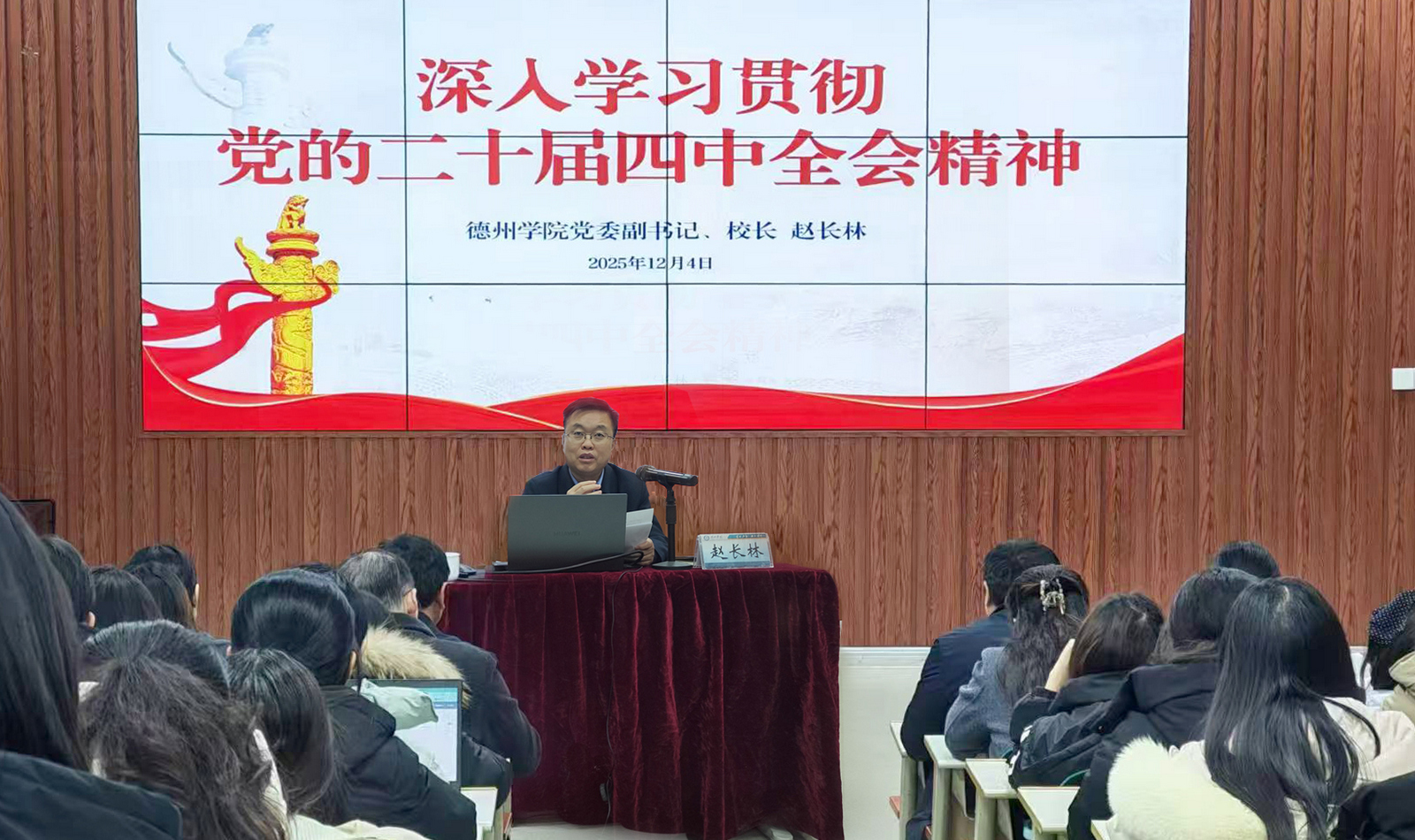 12月4日,党委副书记、校长赵长林以《深入学习贯彻党的二十届四中全会精神 一体推进教育科技人才高质量发展》为题,为教师教育学院师生代表讲授思政课。
