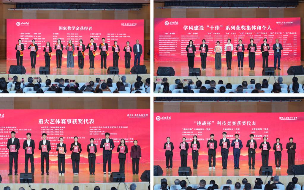 与会领导分别为国家奖学金、省政府奖学金、学风建设“十佳”系列、重大艺体赛事、大学生自强之星、师范技能类大赛、全国重点学科竞赛、“挑战杯”科技竞赛、国家级大学生创新训练计划项目等获奖集体和个人代表颁奖。