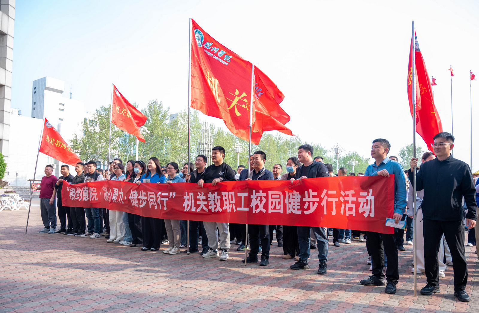 为深入贯彻落实“健康中国”战略,践行“健康第一”理念,坚持“五育并举”教育方针,切实提升师生身心健康水平与团队凝聚力,4月14日,机关党委联合党委宣传部、机关工会、团委、体育学院等单位,共同举办“相约德院・凝心聚力・健步同行”机关教职工校园健步行活动。校党委书记吴君,党委副书记张存峰,党委委员、副校长李甲亮,党委委员、组织部部长杨斌与机关教职工代表一同参加活动。